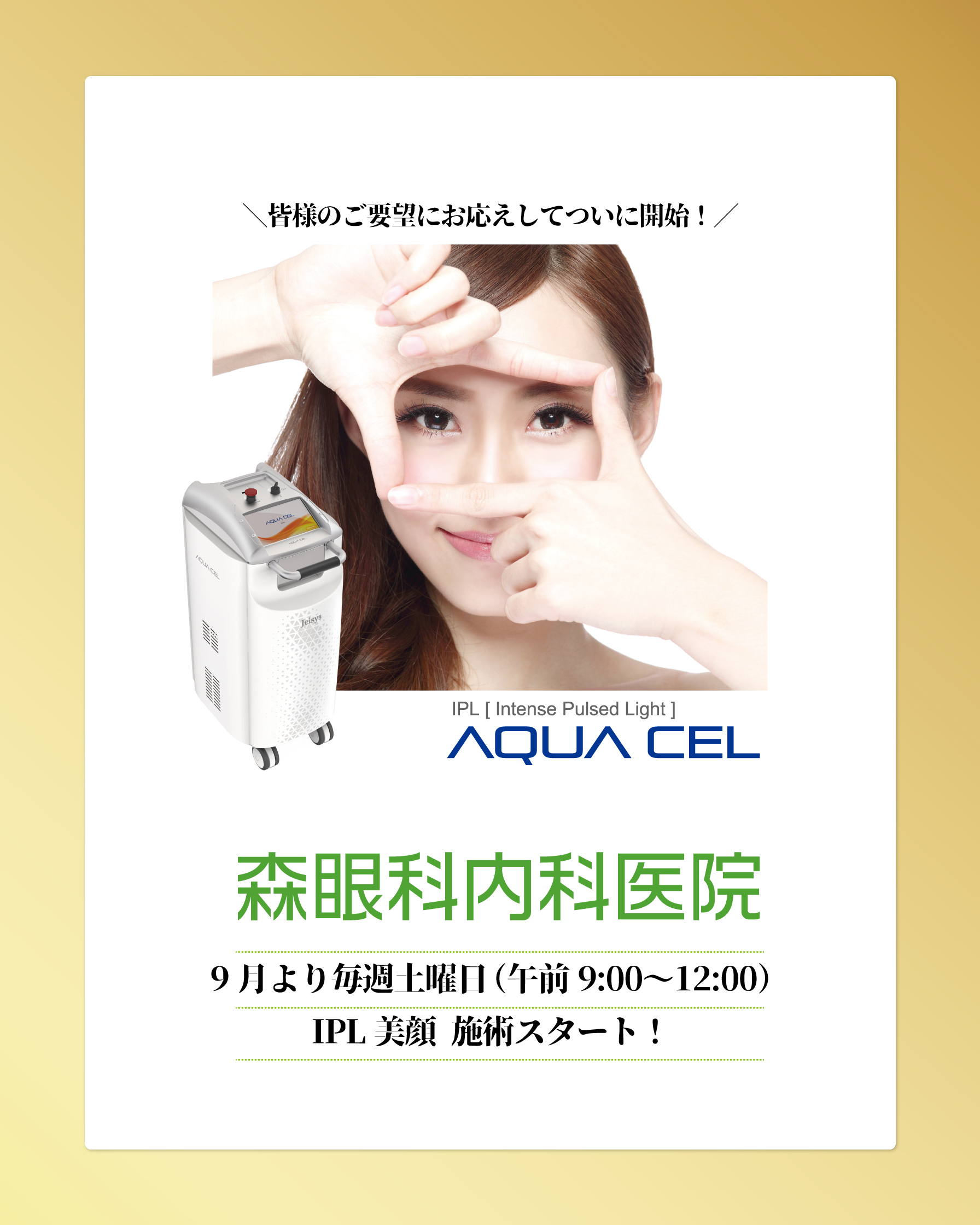 9月より毎週土曜日(午前9:00〜12:00)IPL美顔 施術がついにスタートします!